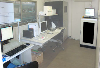 | 「評価パソコン(右奥)」 評価パソコンは選果場コンピュータ室内に設置されています。果実の流れに合わせて、グレーダーから等階級別玉数を受信し、評価データを作成します。評価データは管理パソコン上のファイルに書き込みます。 |